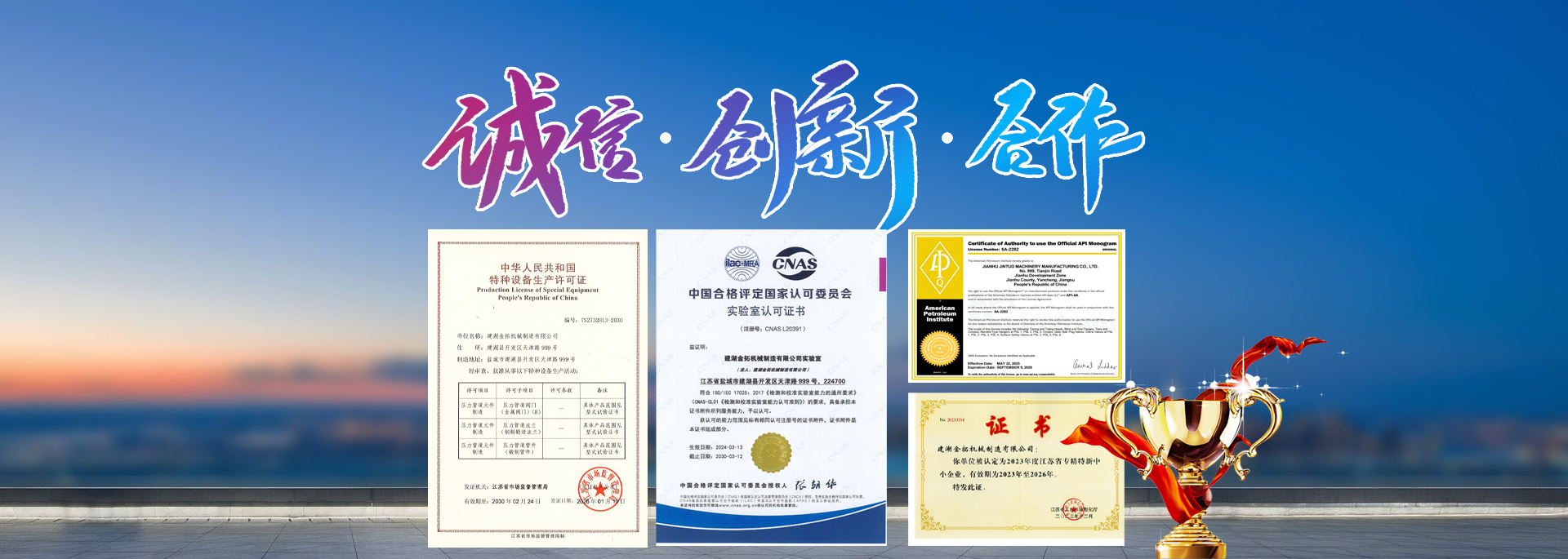 建湖金拓机械制造有限公司,2015年08月07日成立,经营范围包括石油钻采设备、固井压裂设备、工具及配件、阀门管件、汽车配件(除发动机)机械零部件、轴承、万向联轴器、液压元件、环境保护专用设备、电子元器件制造、销售。公司通过了 ISO9001、质量管理体系;ISO14001:2004环境管理体系;GB/T28001职业健康安全管理等体系认证,并严格有效运行。主导产品石油井口装置和采油树、节流压井管汇取得了国家A级特种设备制造许可证。
